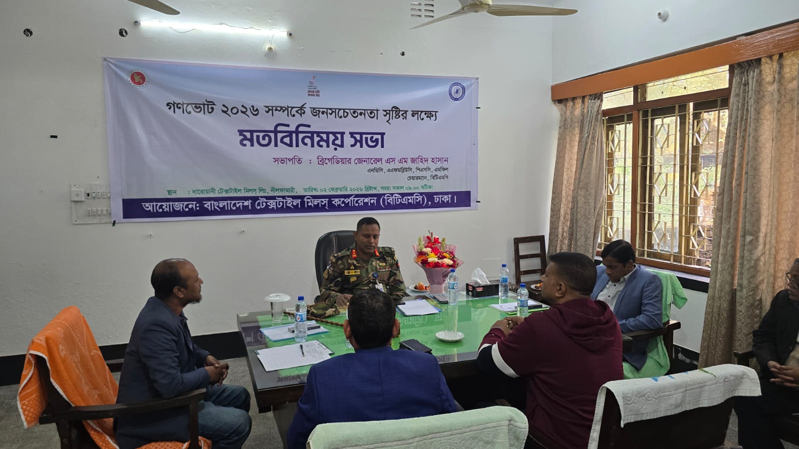 কুড়িগ্রাম, দিনাজপুর ও দারোয়ানী টেক্সঃ মিলের কর্মকর্তা-কর্মচারী, শিক্ষা প্রতিষ্ঠান, ইপিজেডের শিল্প প্রতিষ্ঠান ও স্থানীয় উদ্যোক্তাদের অংশগ্রহণে গণভোট ২০২৬ উপলক্ষে সচেতনতা বৃদ্ধির লক্ষ্যে দারোয়ানী টেক্সঃ মিল, নীলফামারীতে একটি মতবিনিময় সভার স্থির চিত্র।