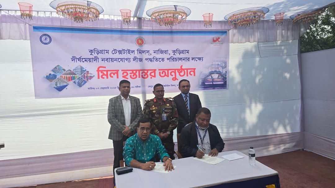 কুড়িগ্রাম টেক্সটাইল মিলস্, নাজিরা, কুড়িগ্রাম দীর্ঘমেয়াদী নবায়নযোগ্য লীজ পদ্ধতিতে পরিচালনার লক্ষ্যে মিল হস্তান্তর অনুষ্ঠানের স্থির চিত্র।